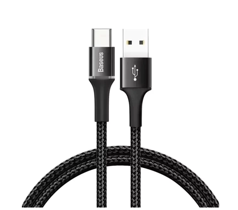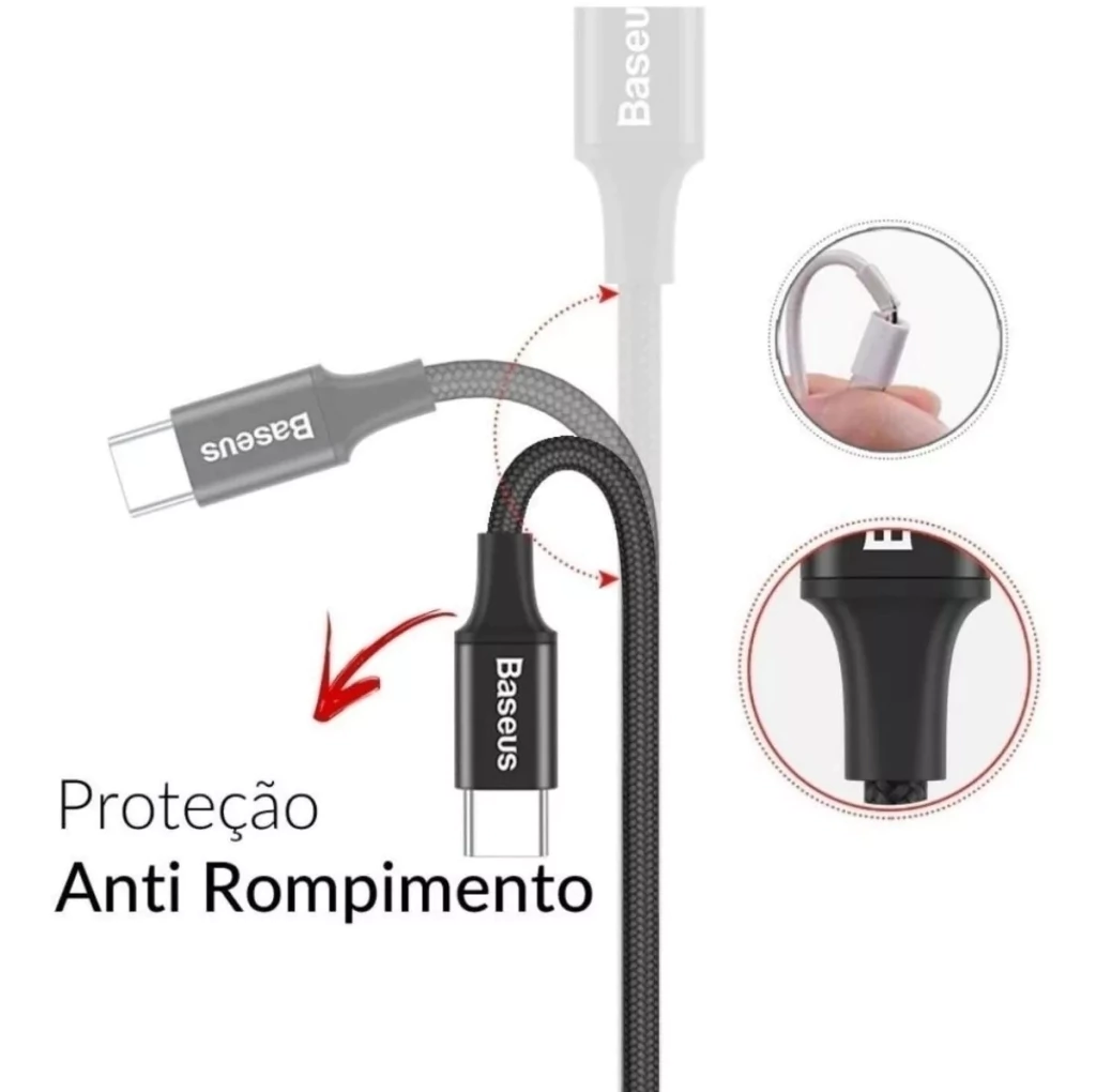 - Cabo da marca Baseus para aparelhos Android com conector de entrada Type-C e outros dispositivos compatíveis com esta entrada.