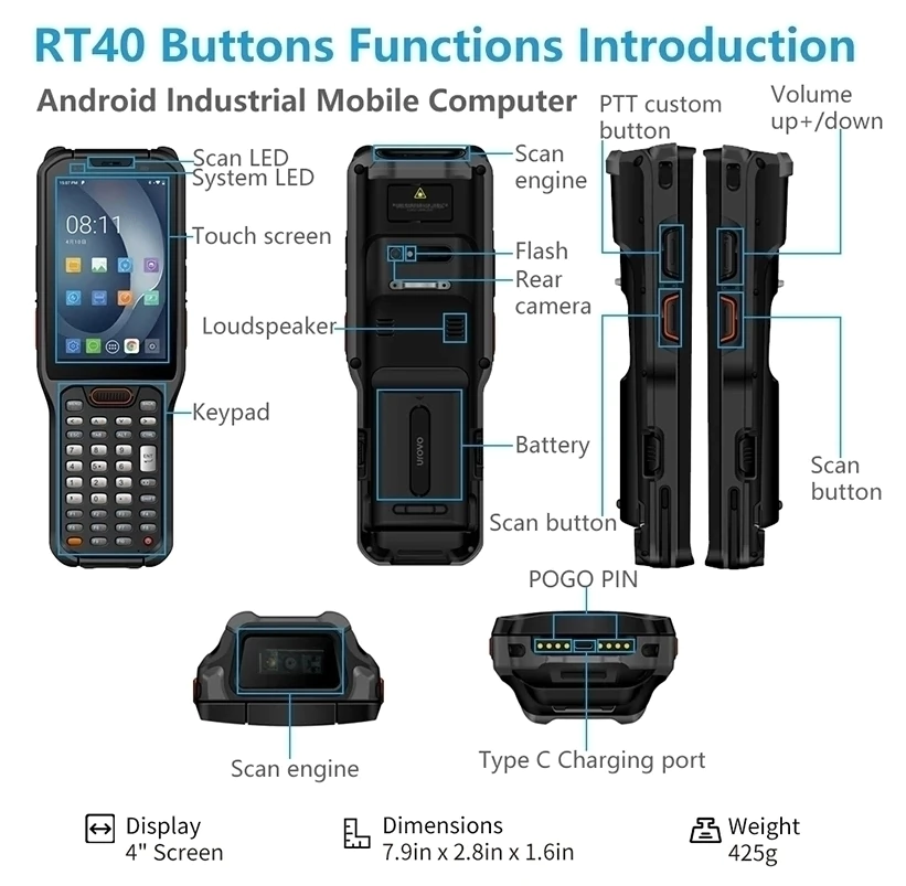 O Coletor de Dados Urovo RT40S é um computador industrial robusto projetado para embientes semi e industruais,com possibilidade de leitura de códigos 1D e 2D e com padrão standard de performance do leitor (SR).